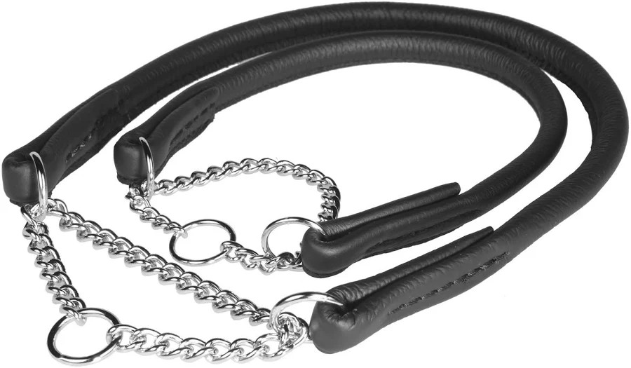 Nahkainen puolikiristävä panta ketjulla on monen kasvattajan ja harrastajan suosima kaulapanta koirilleen. Pyöreä, pehmeästä semianiliini- tai aniliininahasta valmistettu panta luotettavalla ketjulla kestää käytössä. Se on kevyt ja nopea pujottaa koiran kaulaan ja pois. Oikean kokoinen panta pysyy kuitenkin hyvin kaulassa ja jarruttaa etuviistoon kohdistuvassa vedossa niin, ettei se putoa pois kapea- ja / tai matalakalloisilta, matalan niskakyhmyn omaaviltakaan koirilta. Pannan sisällä on venymisen estävä nyöri.Värit: Musta kirkkaalla metalliketjulla